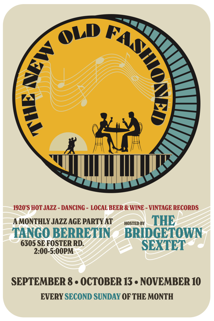 The Bridgetown Sextet, Portland’s premier 1920s and 30s jazz and swing band, presents a monthly event, The New Old Fashioned, a monthly “jazz age party” on the second Sunday afternoon of the month at the cozy and classy Tango Berretin in SE Portland.